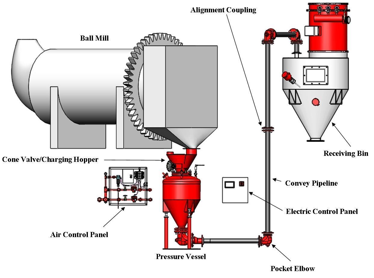Dense phase conveying systems use compressed air at above 1 Barg (0.5 - 0.8 possible dependent on powder and convey line) to push materials from a pressure vessel, transfer unit or pressure pot or vessel through a pipeline to a destination where the air and product are separated by simple small fitler not as lean phase pneumatic conveying system need’s.