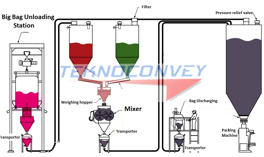 Pneumatic Dense Phase for grount handled, bulk bag unloading, weighed, batched, mixed bulk materials.