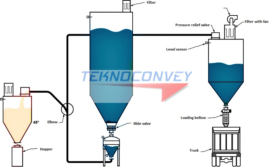 Dense phase conveying systems use compressed air at above 1 Barg (0.5 - 0.8 possible dependent on powder and convey line) to push materials from a pressure vessel, transfer unit or pressure pot or vessel through a pipeline to a destination where the air and product are separated by simple small fitler not as lean phase pneumatic conveying system need’s.