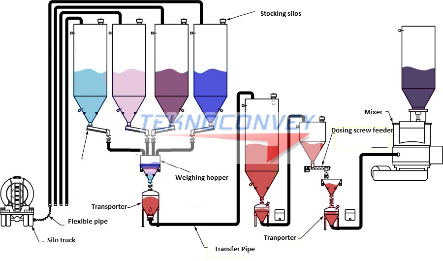 Dense phase pressure conveying systems use compressed air at above 1 Barg (0.5 - 0.8 possible dependent on powder and convey line) to push materials from a pressure vessel, transfer unit or pressure pot or vessel through a pipeline to a destination where the air and product are separated by simple small fitler not as lean phase pneumatic conveying system need’s.